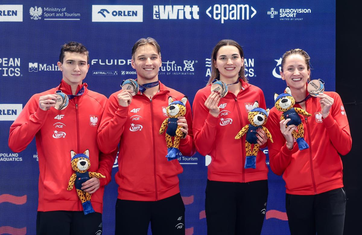 Drugi dzień mistrzostw Europy w pływaniu na krótkiej pływalni w Lublinie znów przyniósł medal dla reprezentacji Polski! Tym razem na trzecim stopniu podium stanęła sztafeta mieszana 4x50 metrów stylem zmiennym w składzie Aleksander Styś, Jan Kałusowski, Kornelia Fiedkiewicz i Katarzyna Wasick, która do tego ustanowiła nowy rekord Polski. To trzeci krążek biało-czerwonych w mistrzostwach w Lublinie!