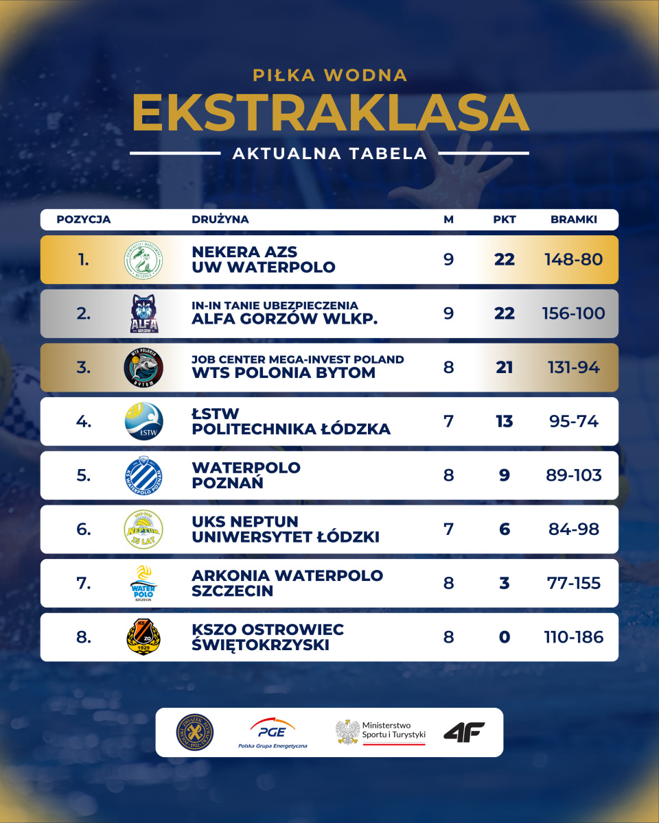Po weekendzie waterpoliści Polonii mają już na swoim koncie 21 punktów w ligowej tabeli. Umocnili się na trzeciej pozycji i tracą zaledwie punkt do wyprzedzających ich dwóch drużyn. Dodatkowo, mają od nich jeden rozegrany mecz mniej. Na czele Ekstraklasy wciąż plasuje się natomiast Nekera AZS UW Waterpolo.