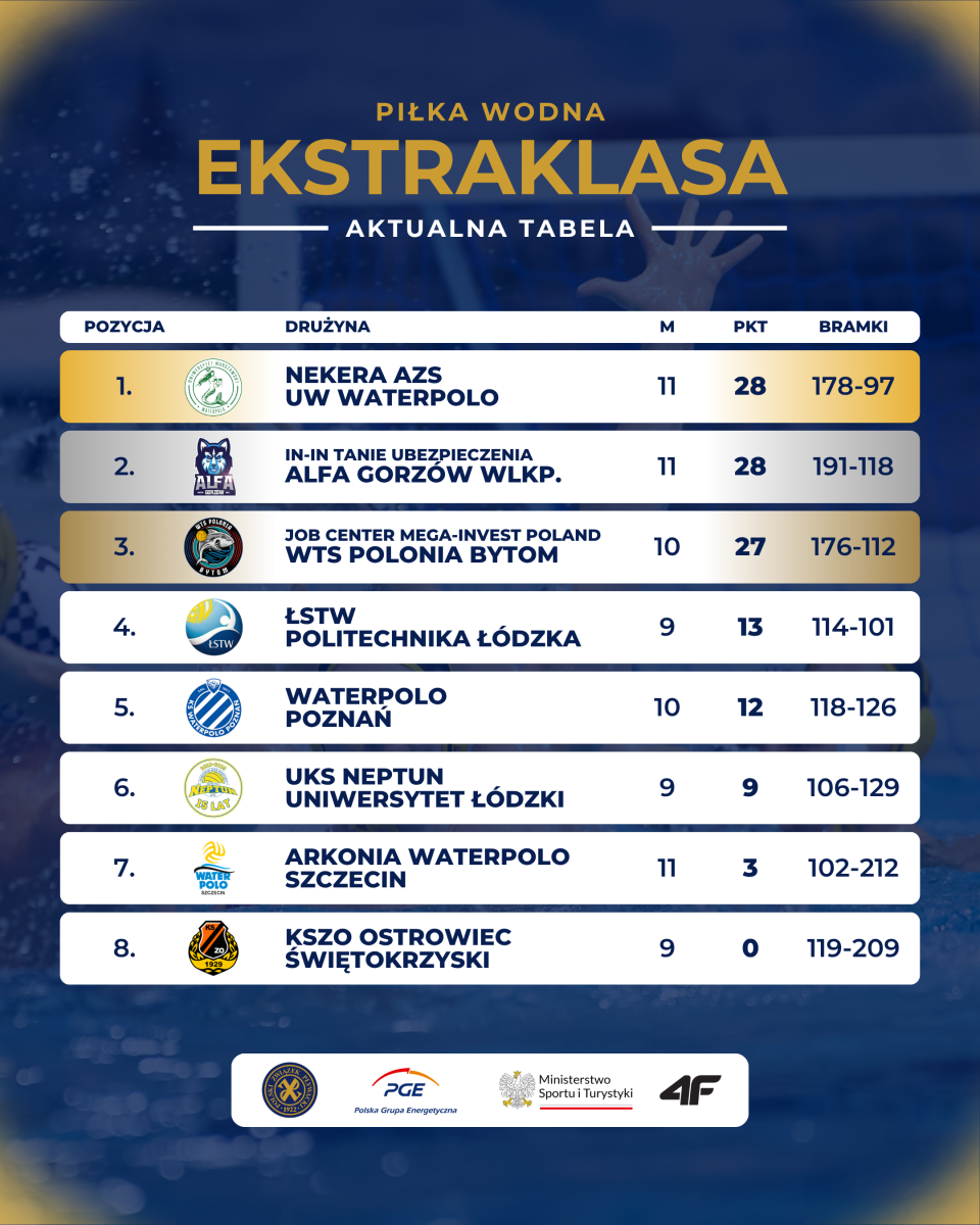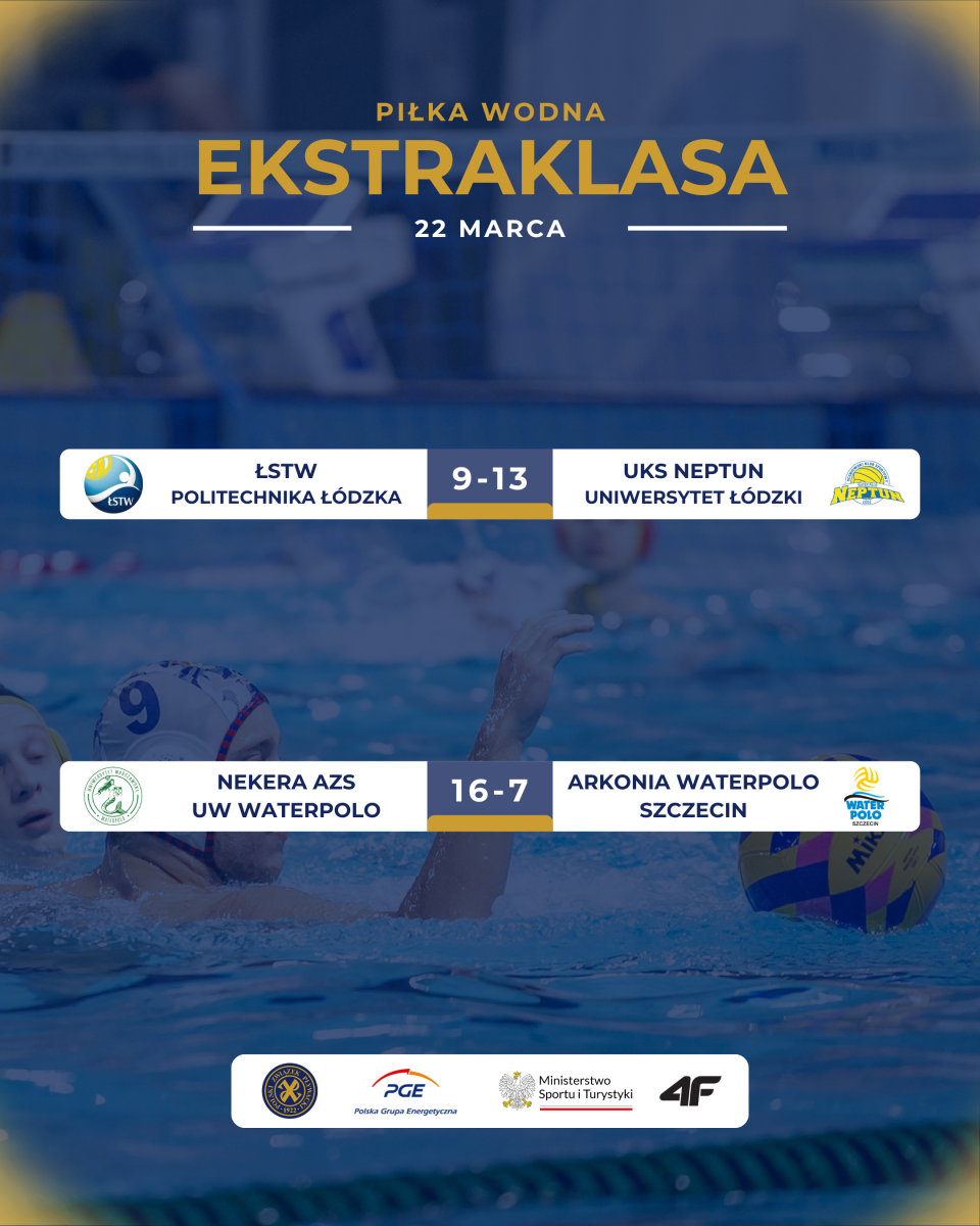 Mimo zwycięstw, zawodnicy Polonii musieli oddać prowadzenie w tabeli. W sobotę wyprzedzili ich gorzowianie, którzy zagrali o jedno spotkanie więcej, a w niedzielę na czele wyścigu o mistrzostwo Polski znaleźli się reprezentanci Nekera AZS UW Waterpolo. Ekipa Uniwersytetu Warszawskiego najpierw wygrała bardzo ciekawy i obfitujący w emocje mecz z ŁSTW Politechnika Łódzka. Grający u siebie Łodzianie długo toczyli zacięty bój o komplet punktów z obrońcami tytułu. Jeszcze na niespełna trzy minuty przed końcową syreną - po trafieniu najlepszego zawodnika ŁSTW w tym starciu Dmytro Hupałowskiego - przegrywali tylko 10:11. Ostatnie słowo należało jednak do gości. Bramki Mirela Catovicia, Andrzeja Maciejewskiego i MVP całego spotkania - Piotra Kędziora sprawiły, że to AZS UW wygrał 14:10.