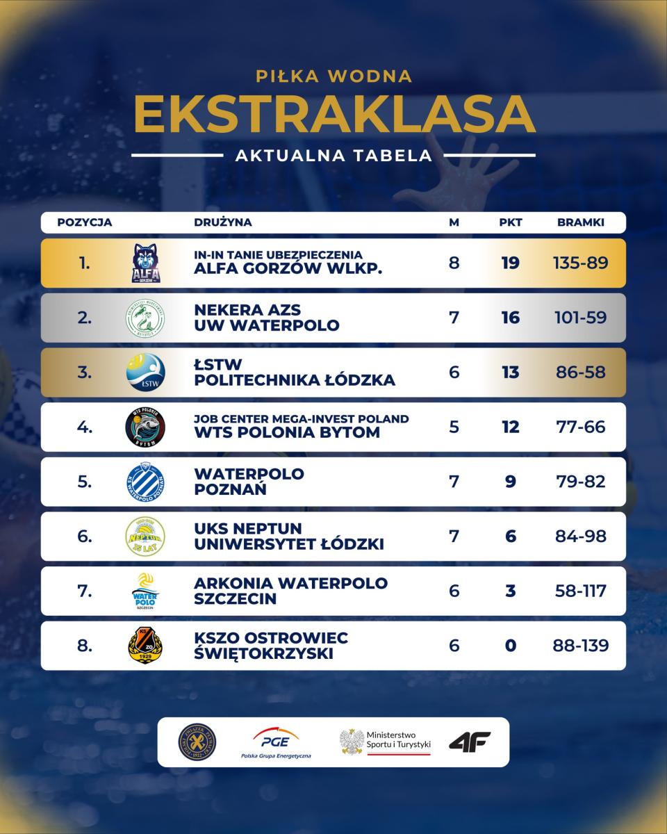 W sobotę dotrzemy do półmetka sezonu 2025/2026 – rozegranych będzie już dokładnie 28 z 56 ligowych meczów. Na dalszą część rywalizacji w Ekstraklasie trzeba będzie poczekać niespełna miesiąc. Ósma runda rozgrywek (pierwsza rewanżowa) została zaplanowana na weekend 14-15 lutego. W tych dniach powinno dojść do spotkań Nekera AZS UW - Waterpolo Poznań, In-In Tanie Ubezpieczenia Alfa Gorzów Wielkopolski - KSZO Ostrowiec Świętokrzyski oraz Job Center Mega-Invest Poland WTS Polonia Bytom - Arkonia Waterpolo Szczecin. Natomiast derby Łodzi pomiędzy ŁSTW i Neptunem zostały przeniesione na 22 marca.
