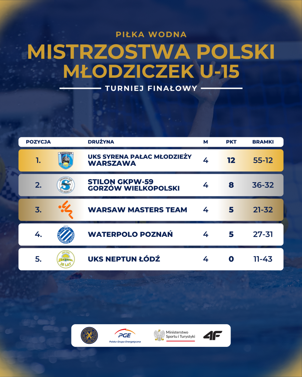 Nowy rozdział w historii kobiecego waterpolo w naszym kraju napisały następujące ekipy do lat 15: UKS Syrena Pałac Młodzieży Warszawa, Warsaw Masters Team, Stilon GKPW-59 Gorzów Wielkopolski, UKS Neptun Łódź i Waterpolo Poznań.