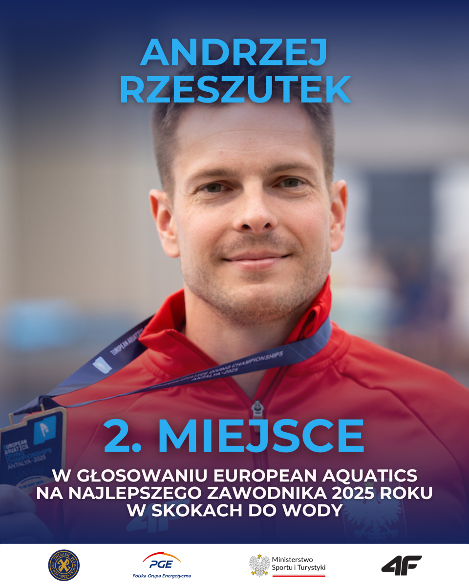 Świetny wynik Andrzeja Rzeszutka w European Aquatics Awards. Nasz reprezentant zajął drugie miejsce w kategorii Najlepszy Skoczek do Wody w 2025 Roku. Mistrza Europy na trampolinie 3 m w głosowaniu wyprzedził tylko znakomity Ukrainiec, Ołeksij Sereda.